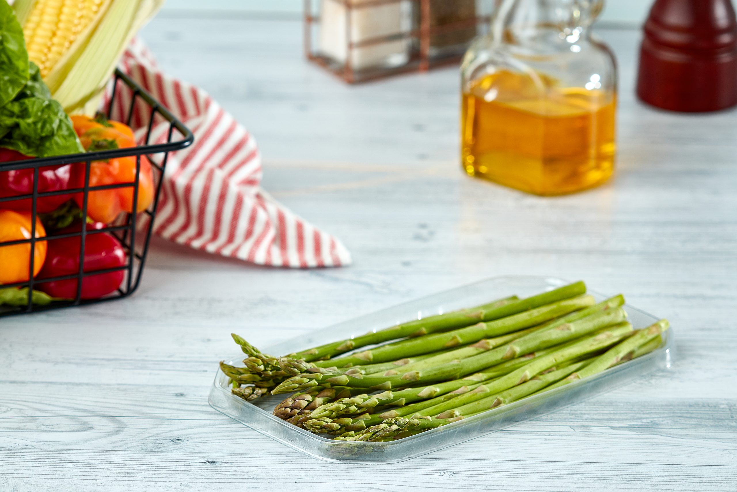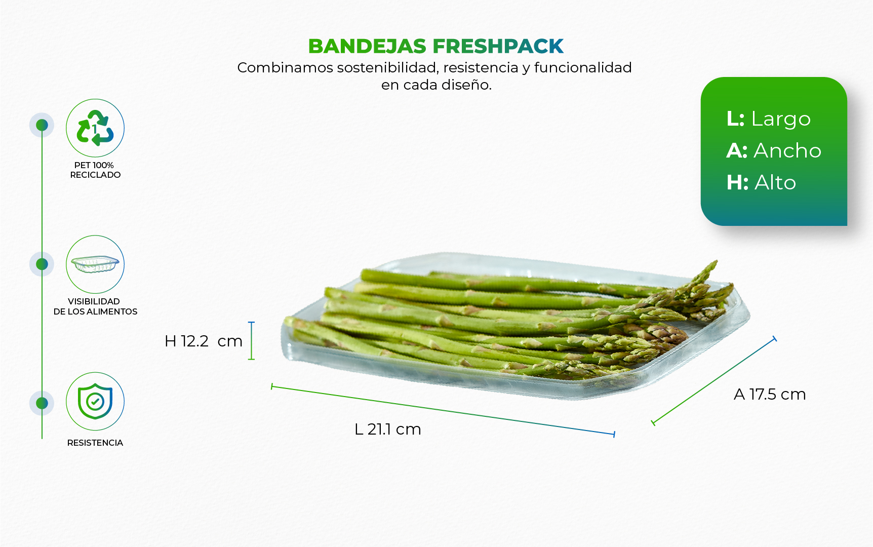 Bandeja multipropósito en PET 100% reciclado (RPET), ideal para exhibir cualquier tipo de alimento. Su diseño de alta resistencia resalta la frescura y mejora la presentación en el punto de venta.