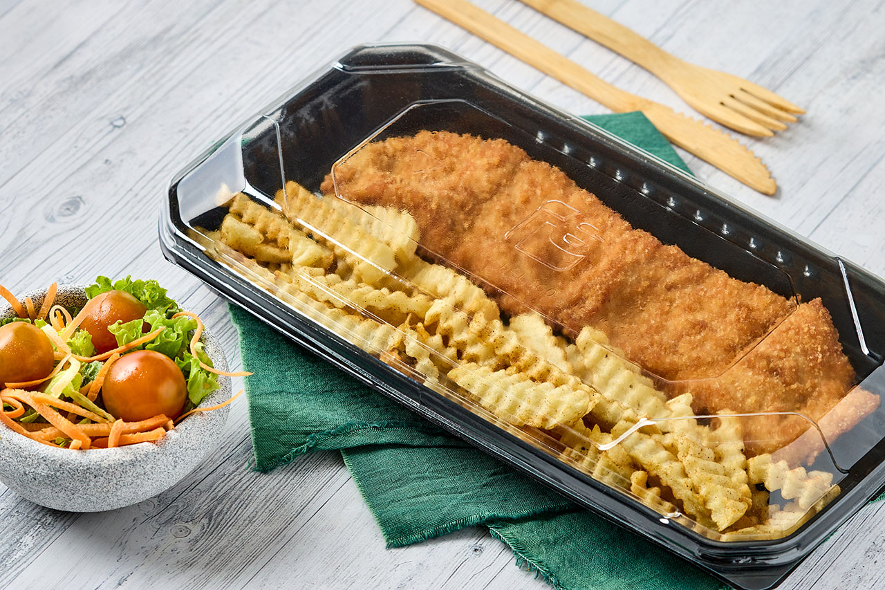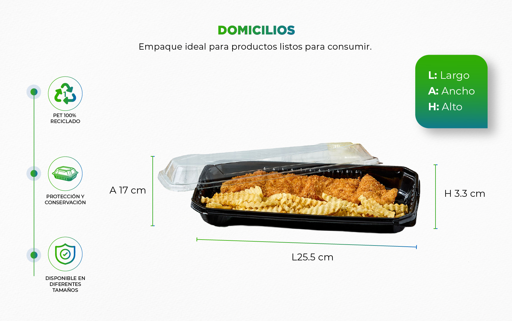 Empaque en PET 100% reciclado (RPET), ideal para productos listos para consumir. Su diseño de alta visibilidad y estructura resistencia protege y conserva la frescura de los alimentos.