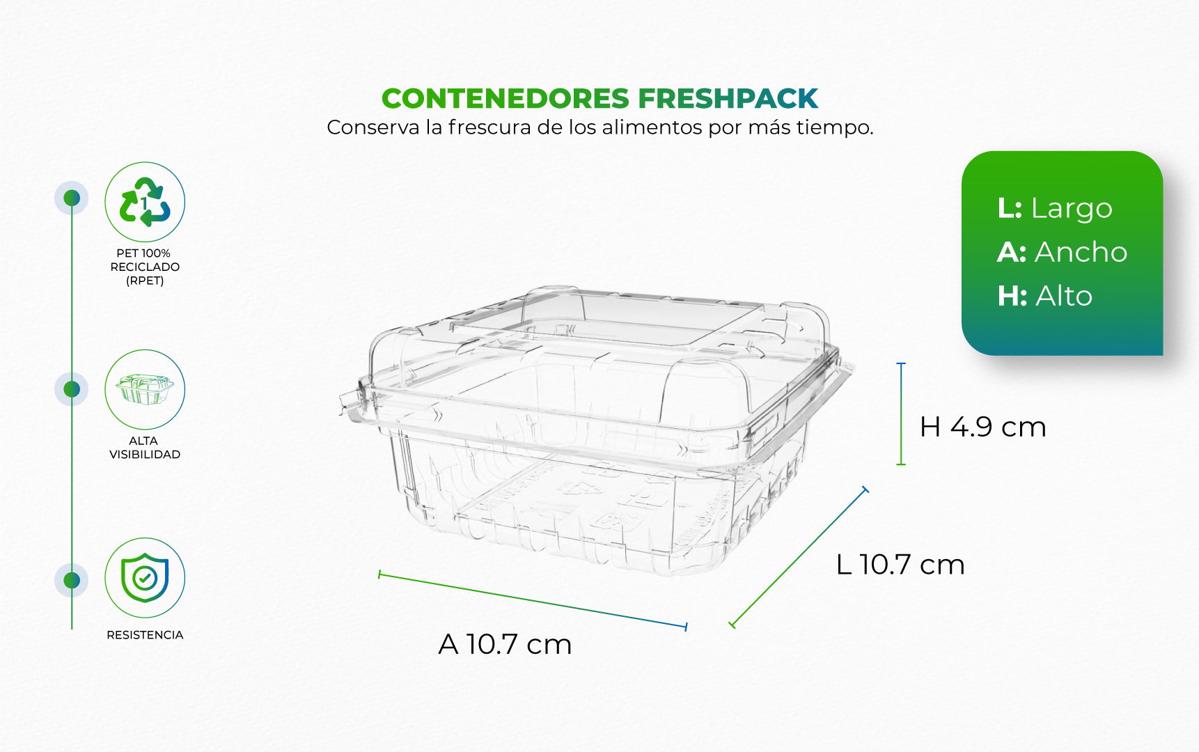 Empaque para frutas y hortalizas en PET 100% reciclado (RPET), con sistema de ventilación que conserva, protege y exhibe la frescura de los alimentos por más tiempo en el punto de venta.